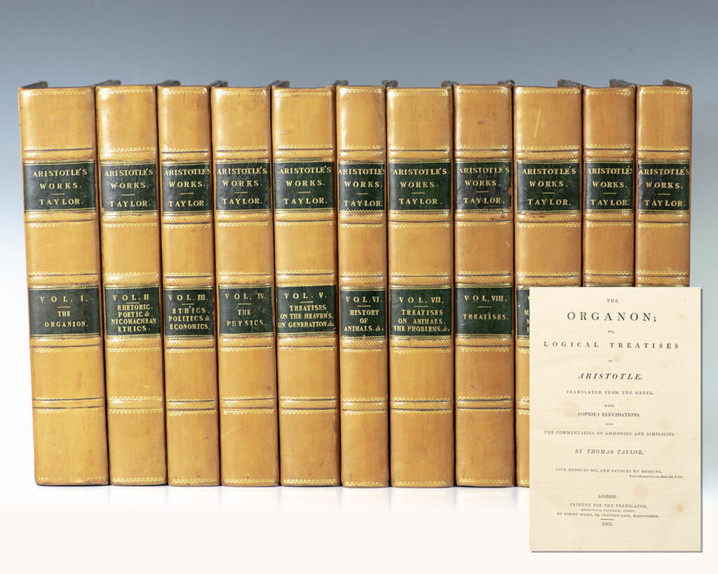 Exceptionally rare complete set of the first edition in English of the works of Aristotle, signed by the translator Thomas Taylor in volumes one and four.