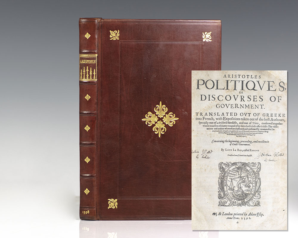 First edition in English of Aristotle’s A Treatise on Government. Quarto, bound in three quarters leather over marbled boards.