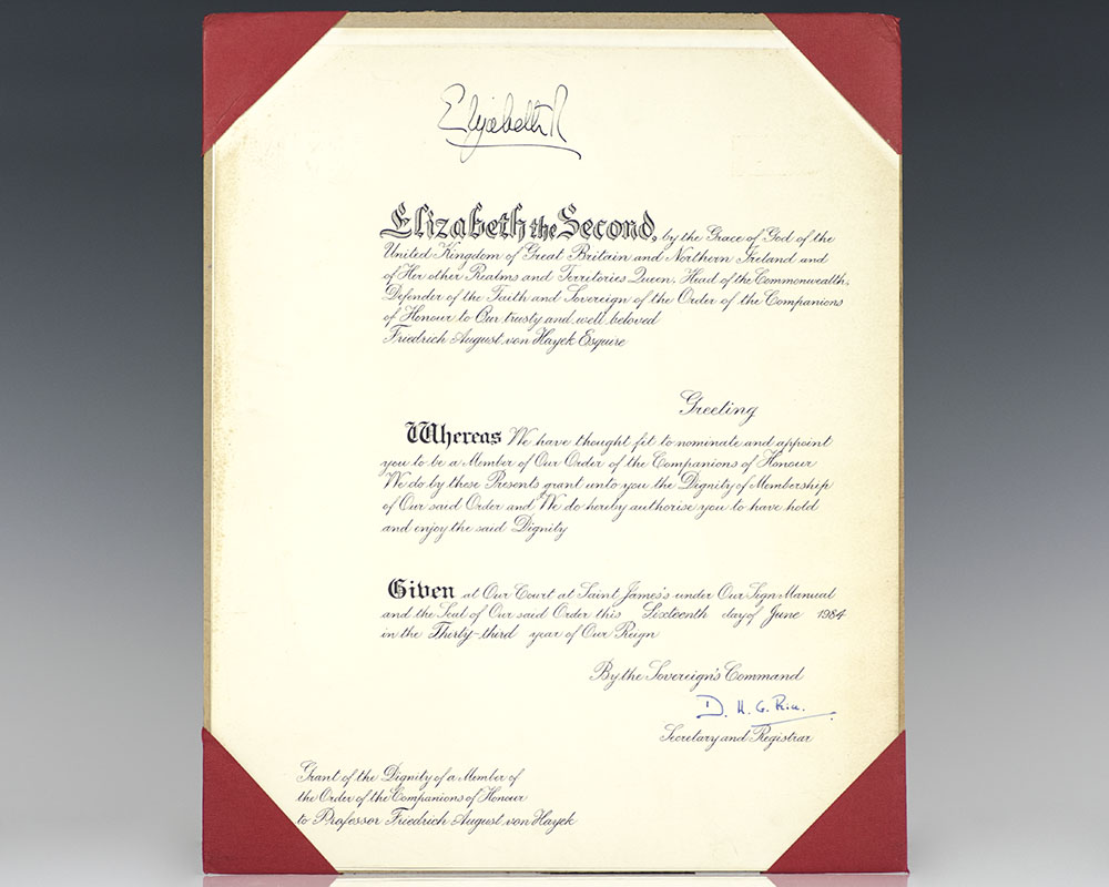 Hayek is also well known for his influence upon British Prime Minister Margaret Thatcher. She once held up a copy of his Constitution of Liberty before a meeting of British Conservatives and said “This is what we believe.” So profound was her respect for Hayek’s work, despite their limited interaction, that she advised Queen Elizabeth II to award Hayek the Royal Companion of Honour. He was duly awarded in 1984 for his contributions to the field of economics and English public policy, which he later called “the happiest day of my life.”