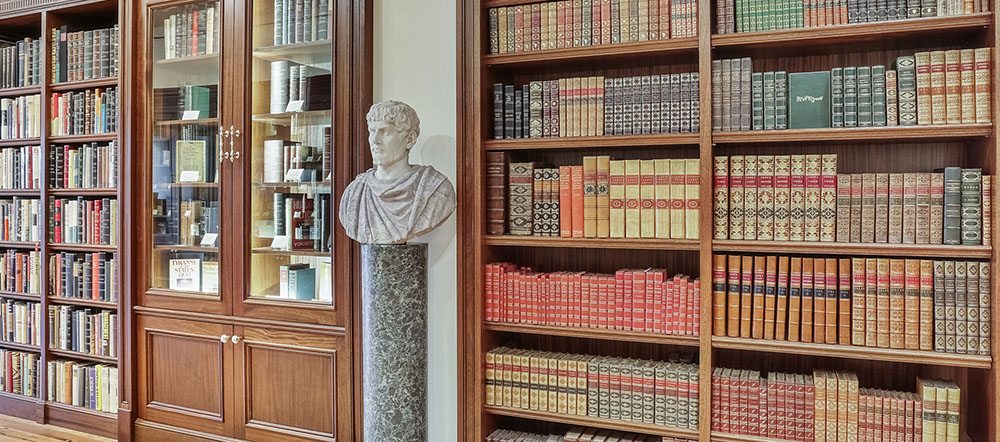 Mix in darker tones and plush fabrics to create a sense of comfort inside your library. You want to create a space that inspires people to curl up and dive into a new world inside the pages of a novel, and a space filled with cozy blankets, warm pillows, and darker hues will help make that happen. raptis-rare-books-who-we-are