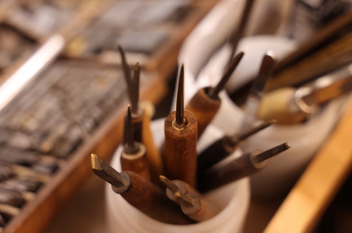 Today, Harcourt employs six artisans and is seeking more. Griglack trained at North Bennet Street School, and the bindery now trains its own apprentices, including Santiago, a recent MassArt graduate.