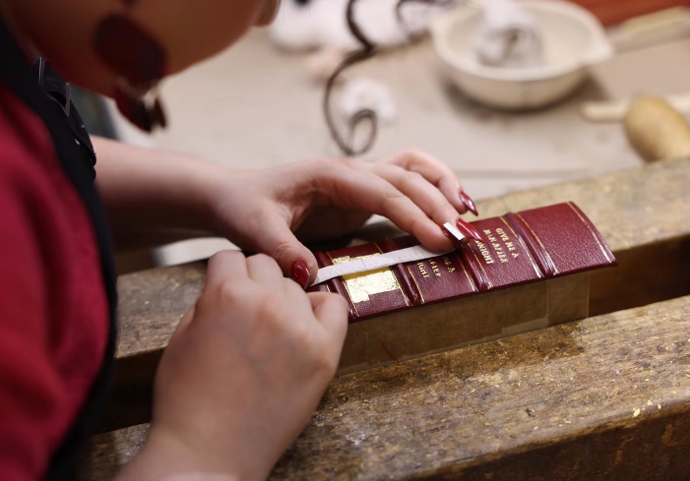 On a shelf in the Harcourt Bindery sit the kind of books that seem to call for an armchair, a glass of port, and a roaring fire. Bound in leather and decorated with gold leaf, their spines reinforced with hand-sewn stitches, these are ornaments as well as books—rare editions that can sell for hundreds or even thousands of dollars.