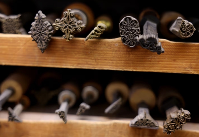 Jeidy Ryan, a 21-year veteran, stitches pages together by hand at a wooden sewing frame. Frank Jones, 63, compresses the books in a hand-cranked press, pounding the spines into shape with a broad-headed hammer. “I’ll die at my desk, most likely,” he joked.