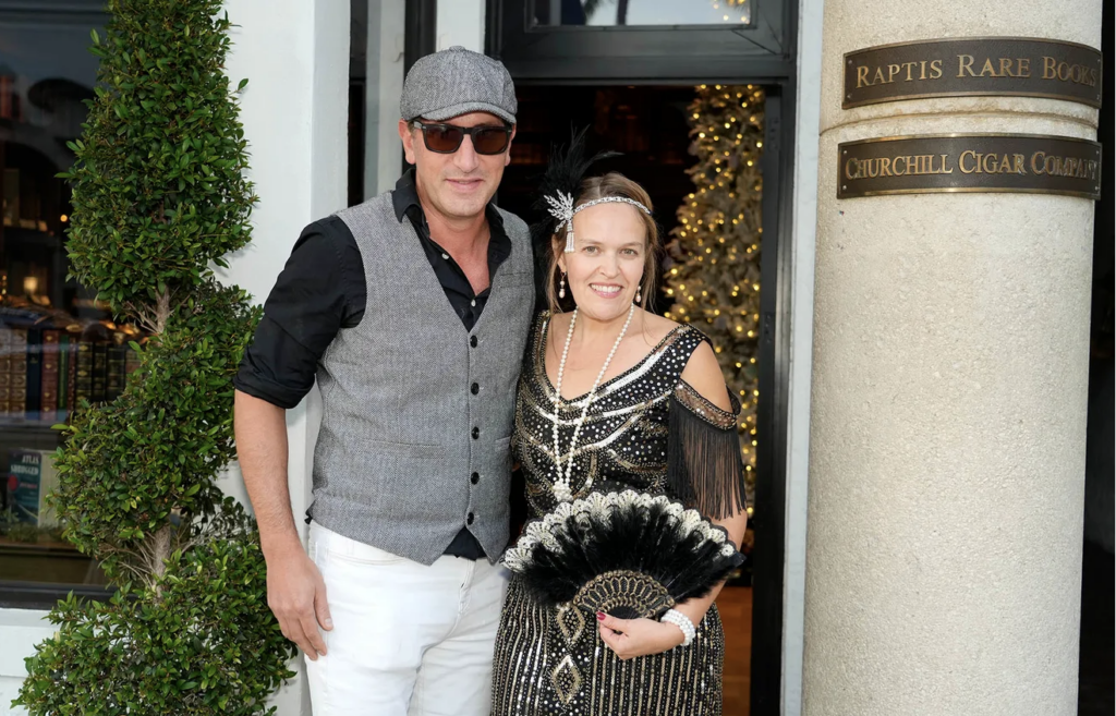 Raptis Rare Books owners Matthew and Adrienne Raptis host a 100th anniversary celebration of The Great Gatsby December 19, 2025 in Palm Beach. During the celebration guests were given the chance to see the store’s inscribed Great Gatsby first edition in its original dust jacket created by painter and graphic designer Francis Cugat in 1924. Guests were encouraged to wear 1920’s fashion for the event.