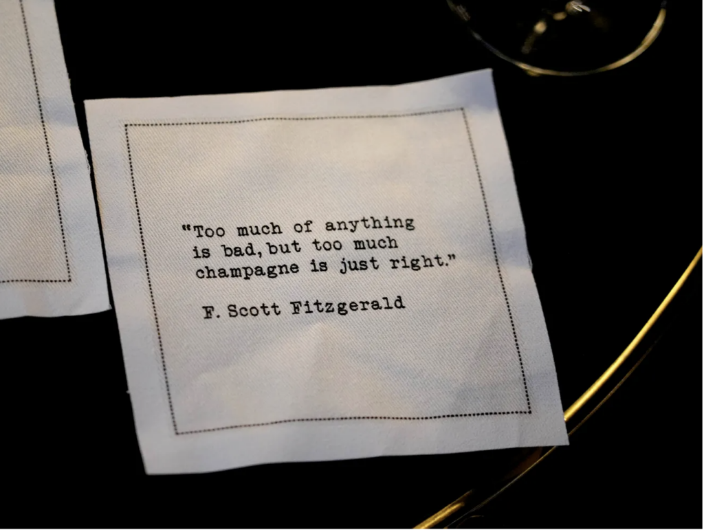 A napkin with a quote by F. Scott Fitzgerald decorates Churchill Cigar Lounge as Raptis Rare Books hosts a 100th anniversary celebration of The Great Gatsby December 19, 2025 in Palm Beach. During the celebration guests were given the chance to see the store’s inscribed Great Gatsby first edition in its original dust jacket created by painter and graphic designer Francis Cugat in 1924. Guests were encouraged to wear 1920’s fashion for the event.