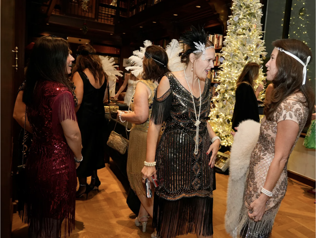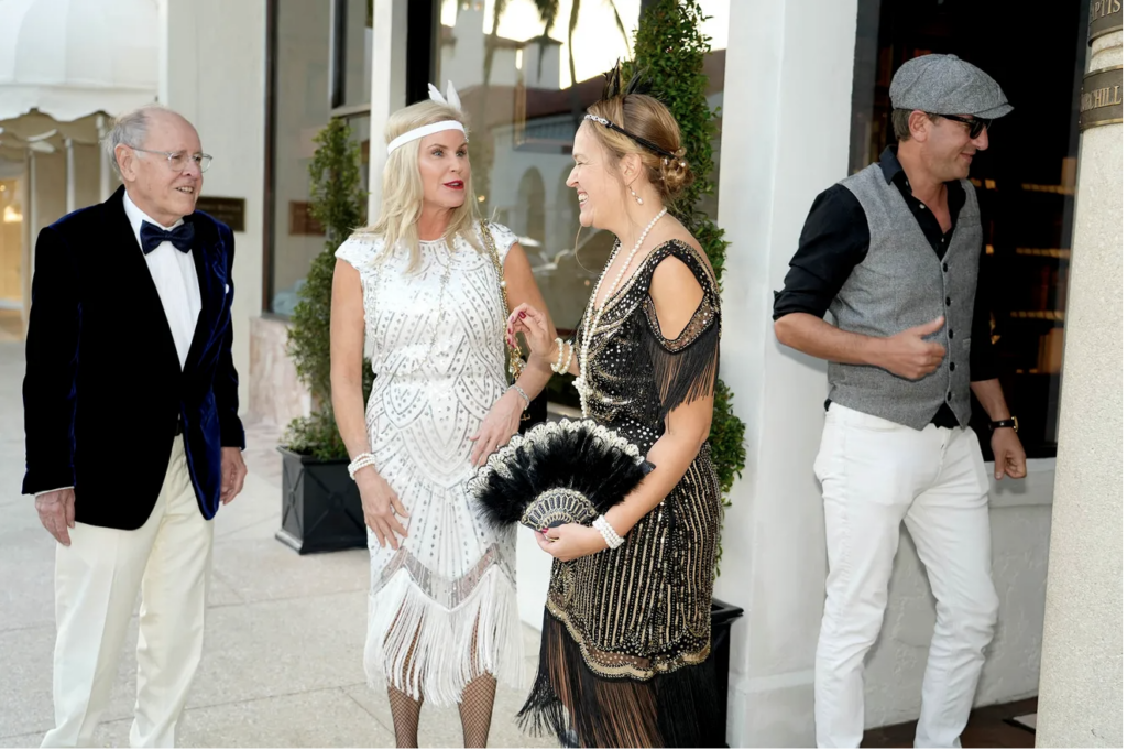 Chuck and Beth Bushong greet Raptis Rare Books owners Adrienne and Matthew Raptis as they host a 100th anniversary celebration of The Great Gatsby December 19, 2025 in Palm Beach. During the celebration guests were given the chance to see the store’s inscribed Great Gatsby first edition in its original dust jacket created by painter and graphic designer Francis Cugat in 1924. Guests were encouraged to wear 1920’s fashion for the event.