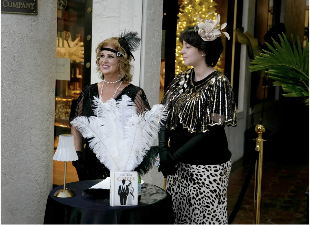 Raptis Rare Books employees Denise Tamucci, from left, and Alexa Osorio greet guests during the 100th anniversary celebration of The Great Gatsby December 19, 2025 in Palm Beach. During the celebration guests were given the chance to see the store’s inscribed Great Gatsby first edition in its original dust jacket created by painter and graphic designer Francis Cugat in 1924. Guests were encouraged to wear 1920’s fashion for the event.