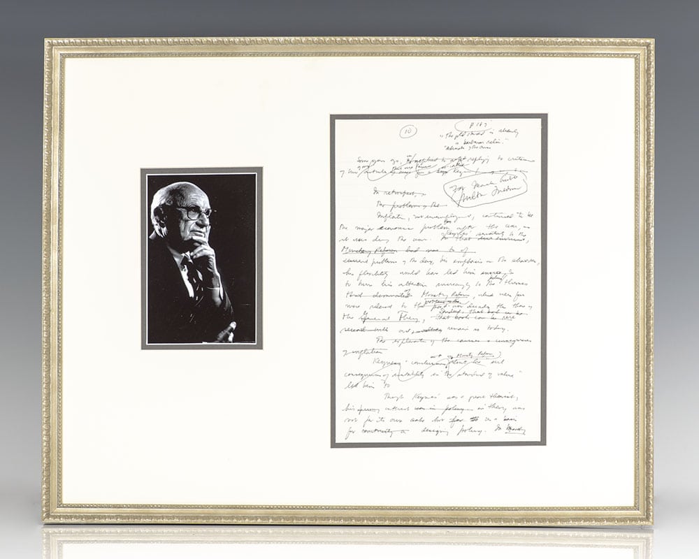 One page signed and hand-corrected manuscript entirely in the hand of Nobel Prize-winning economist Milton Friedman discussing Keynes’ The General Theory.