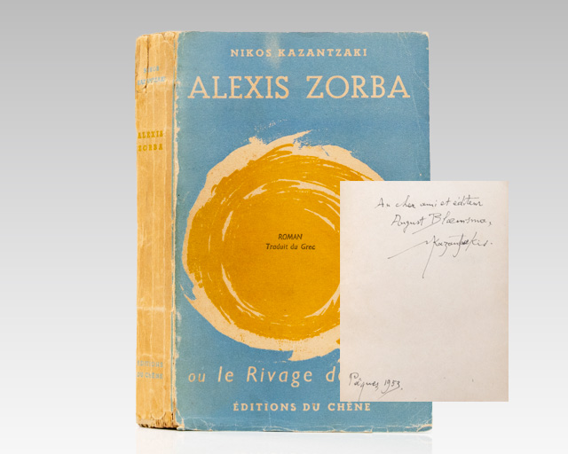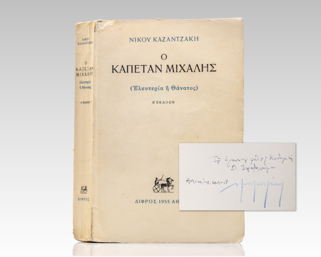 First Greek edition of Kazantzakis’ classic novel. Octavo, original wrappers. Boldly signed by Nikos Kazantzakis on the front free endpaper. In very good condition, inscription. First editions are rare, signed examples exceptionally so.
