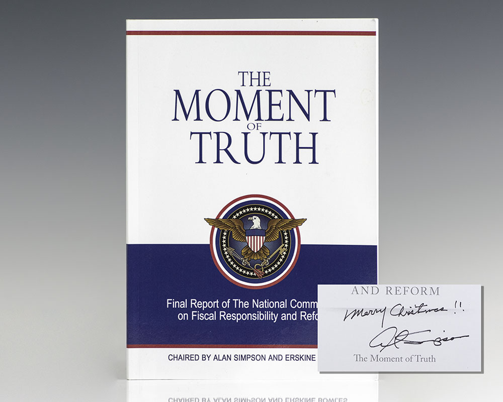 First edition of Simpson and Bowles’ final report on The National Commission on Fiscal Responsibility and Reform. Octavo, original illustrated wrappers. Signed by Alan Simpson on the half-title page, “Merry Christmas!! Alan Simpson.” In fine condition.