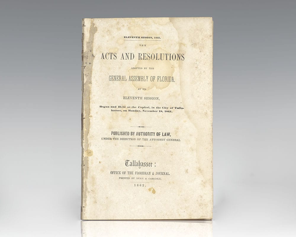 Rare first edition documenting the acts and resolutions passed by the General Assembly of Florida in the first year of the American Civil War. Octavo, disbound. In very good condition. Scarce and desirable.