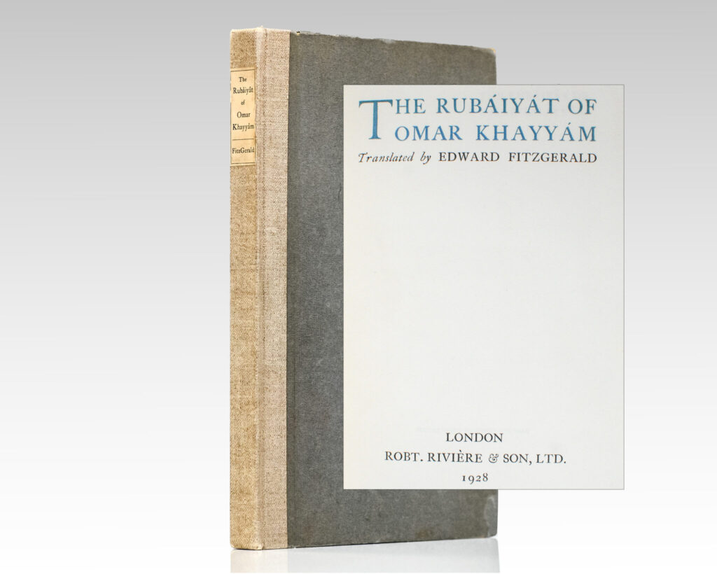 Special edition of The Rubaiyat of Omar Khayyam, rendered into English Verse by Edward Fitzgerald. Octavo, original publisher’s half-cloth with paper titles to the spine, printed on Studio hand-made paper, reprinted from Fitzgerald’s translation published in 1859. In very good condition, bookplate to the front pastedown.