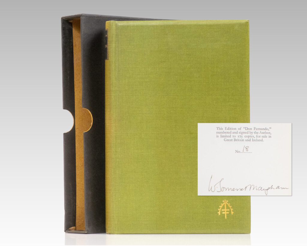 Signed limited edition of this exploration and celebration of Spain’s Golden Age. Octavo, original publisher’s cloth with gilt titles to the spine, top edge gilt, silk ribbon bound in. One of 175 numbered copies, this is number 18. Boldly signed by W. Somerset Maugham on the limitations page. In near fine condition, bookplate to theContinue reading "Don Fernando."