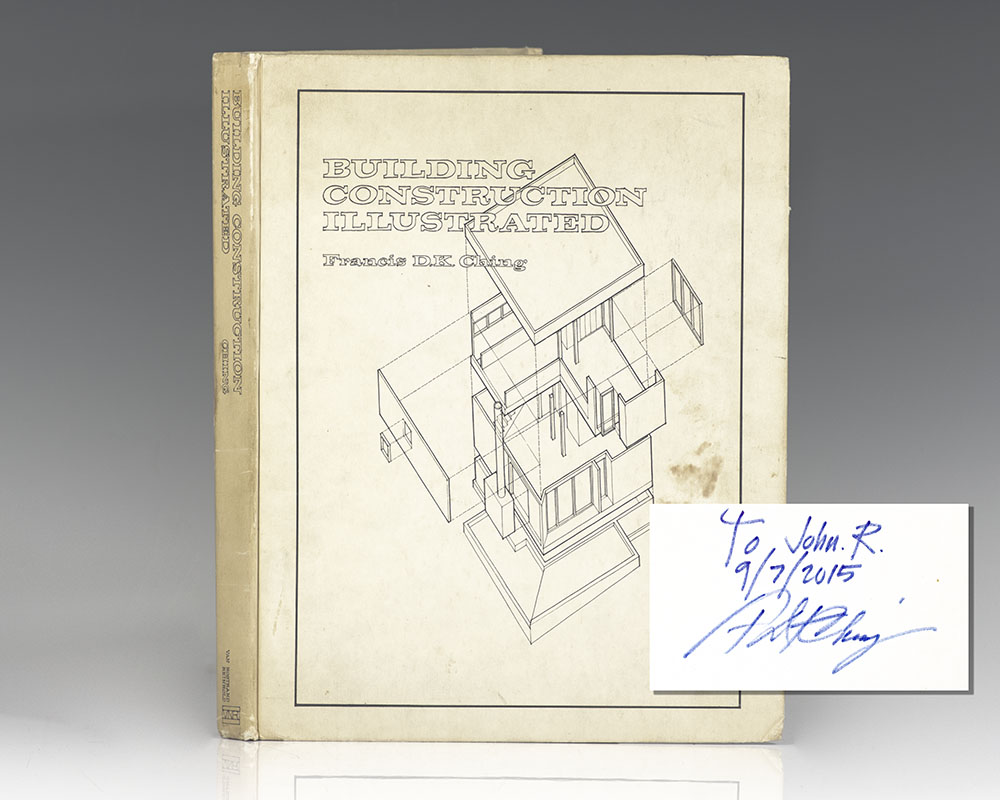 First edition of this classic work. Quarto, original illustrated boards, illustrated throughout. Presentation copy, inscribed by the author on the front free endpaper, “To John R. 9/7/2015 Francis D.K. Ching.” In very good condition, owner name to the front free endpaper and pastedown.