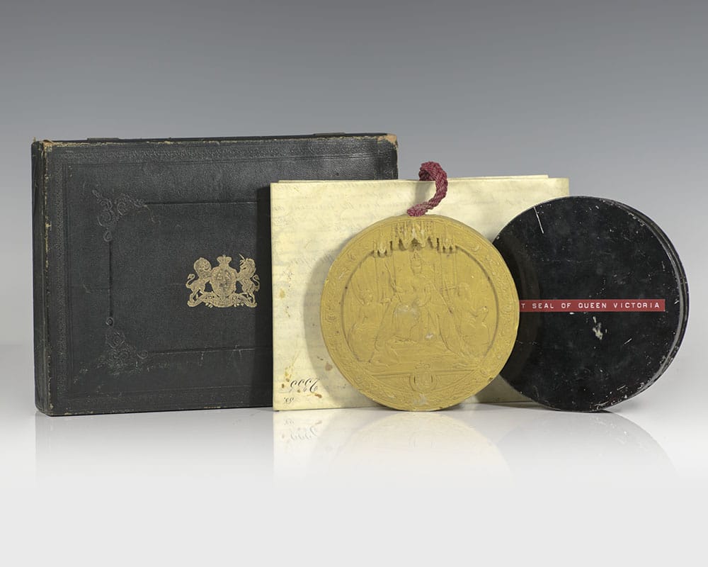 Rare wax Great Seal of Queen Victoria presented with a large, elaborately illustrated patent granted to William Edward Newton. Housed in a custom metal case, the patent measures 7 inches in diameter and depicts Queen Victoria on the Royal Throne flanked by two ladies in waiting. The seal is affixed to the patent with aContinue reading "The Great Seal of Queen Victoria with Royal Patent."