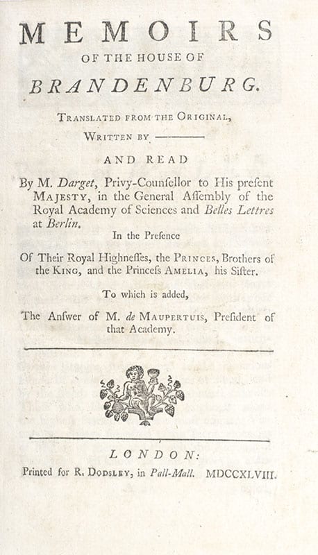 Early English translation of Frederick II, King of Prussia’s history of the Brandenburg Dynasty. Dedicated to his Royal Highness to Prince of Wales. Authors Preface. Initially published in three installments by Frederick II’s private press at the palace of Sanssouci near Berlin, the volumes were read as part of the curriculum at the Prussian AcademyContinue reading "Memoirs of the House of Brandenburg."