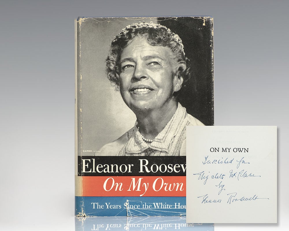First edition of Roosevelt’s last book of autobiography. Octavo, original blue cloth, illustrated with 16 pages of photographs. Presentation copy, inscribed by the author on the half-title page, “Inscribed for V____  M_____ by Eleanor Roosevelt.” Near fine in a very good dust jacket with some rubbing and wear. Jacket design by Ben Feder.