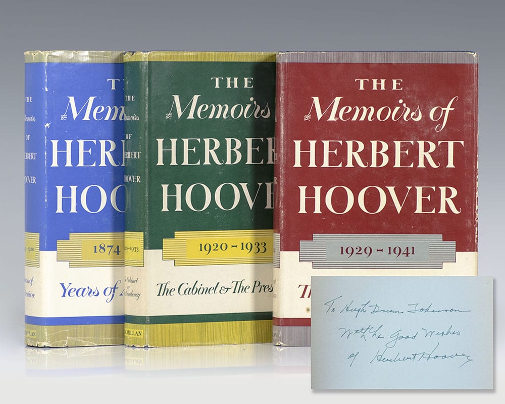 First editions of each volume in Hoover’s memoirs. Octavo, 3 volumes, illustrated. Each volume is inscribed by Herbert Hoover on the front free endpaper. Each are near fine in near fine dust jackets. Includes: Volume One: Years of Adventure 1874-1920; The Cabinet and the Presidency 1920-1933; The Great Depression 1929-1941. Includes an original photograph ofContinue reading "The Memoirs of Herbert Hoover: Years of Adventure 1874-1920; The Cabinet and the Presidency 1920-1933; The Great Depression 1929-1941: Three Volume Complete Set."