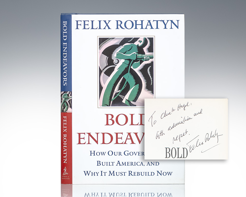 First edition of this work by the legendary banker. Octavo, original boards. Presentation copy, inscribed by the author, “To Chuck Hagel: With admiration and respect Felix Rohatyn.” The recipient, Chuck Hagel is a American politician and Army veteran who served as the 24th United States secretary of defense from 2013 to 2015 in the administration of Barack Obama. He previously served asContinue reading "Bold Endeavors: How Our Government Built America, and Why It Must Rebuild Now."