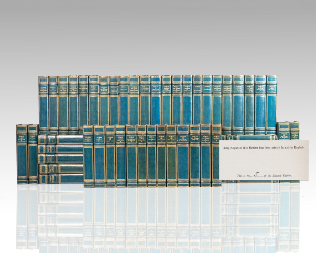 Rare limited edition of the works of Dumas, one of only 50 copies of the Illustrated Library Edition of the complete works of Alexandre Dumas. Octavo, 60 volumes bound in three quarter blue morocco by Bumpus over marbled boards with gilt titles and ruling to the spine in four compartments within raised gilt bands, topContinue reading "The Works of Alexandre Dumas, Including: The Count of Monte Cristo, The Three Musketeers, Twenty Years After, and The Vicomte de Bragelonne: Ten Years Later."