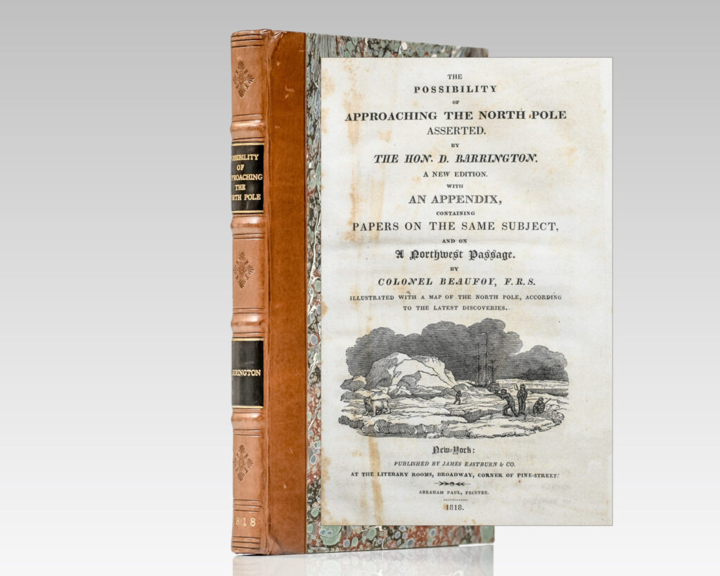 First separate American edition of this work arguing that reaching the North Pole was possible. Octavo, bound in modern half brown calf over marbled boards with gilt titles and tooling to the spine in five compartments within raised bands, black calf spine labels, title page vignette, with a folding frontispiece map of the North Pole.Continue reading "The Possibility of Approaching the North Pole Asserted."