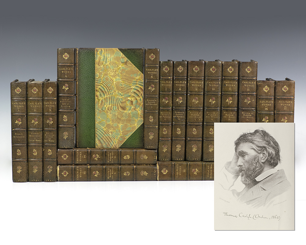The Ashburton edition of Carlye’s complete works. Octavo, seventeen volumes bound in three quarter morocco over marbled boards with gilt titles and tooling to the spine in six compartments within raise bands, top edge gilt with others uncut, marbled endpapers, frontispiece portrait of Carlyle to volume one. In very good condition.