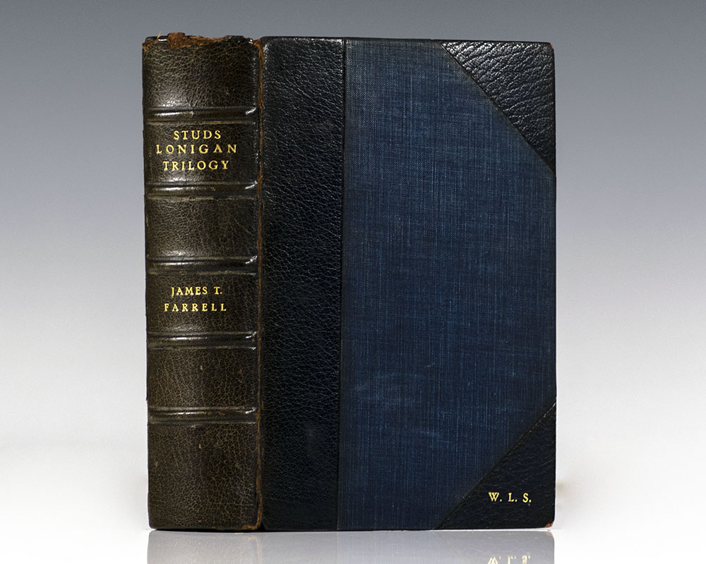 First edition, early printing of Farrell’s well-regarded trilogy. Octavo, bound in three quarter morocco with gilt titles and raised bands to the spine, marbled endpapers, top edge gilt. Association copy, inscribed by the author on the front free endpaper, “Jan 9/ 1950 For Bill Safire with best wishes Jim Farrell.” The recipient, William Safire wasContinue reading "Studs Lonigan. A Trilogy Containing Young Lonigan, The Young Manhood of Studs Lonigan, and Judgment Day."