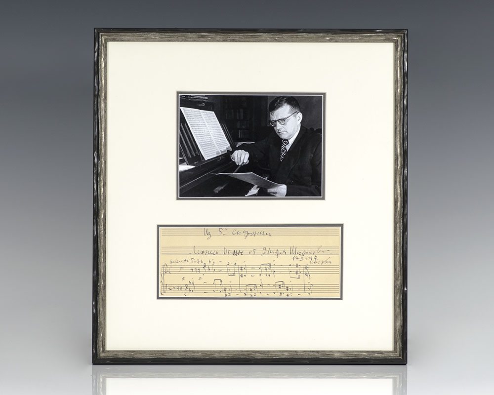 Handwritten musical quotation inscribed by Russian composer and pianist Dmitri Dmitriyevich Shostakovich in Russian above the opening three bars of Shostakovich’s Symphony No. 5 in D minor (Op. 47) on a two-stave system with holograph tempo directive and title, “To Lionel Okvin from Dmitri Shostakovich 17th February 1947.” Double matted and framed with a photographContinue reading "Dmitri Shostakovich Autograph Musical Quotation Signed."