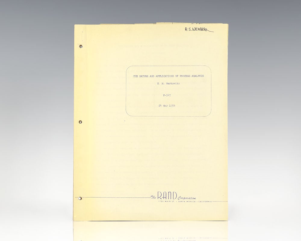 Rare research memorandum written by Nobel Prize-winning economist Harry M. Markowitz providing an economy-wide process analysis model to “predict what combination of civilian and military outputs can and cannot be produced with specified national resources.” Octavo, 23 pages typescript on original Project Rand Research Memorandum letterhead including two folding graphs concerning technological and mechanical resourcesContinue reading "The Nature and Applications of Process Analysis."