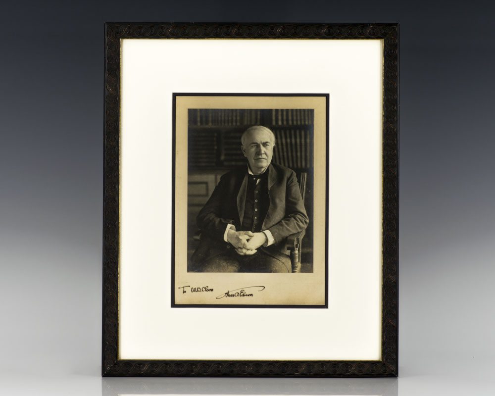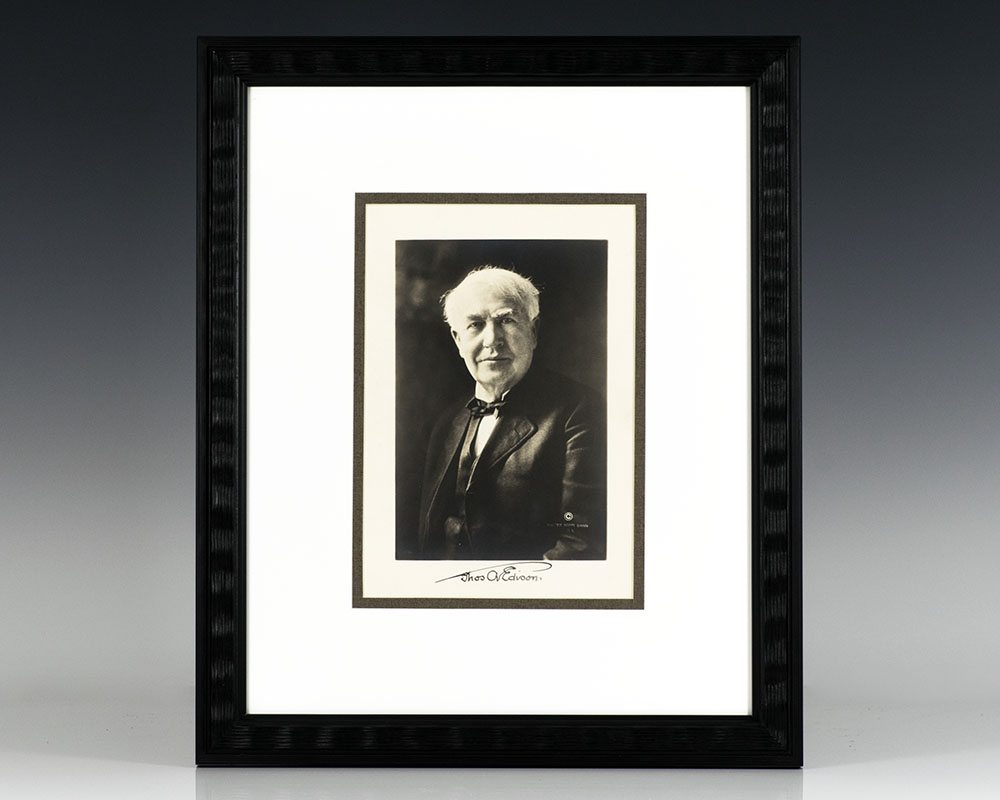 Large signed photograph of Thomas Edison showing him in his library with hands clasped. Inscribed by Thomas Edison. Double matted and framed. The entire piece measures 15.5. inches by 18.5 inches.