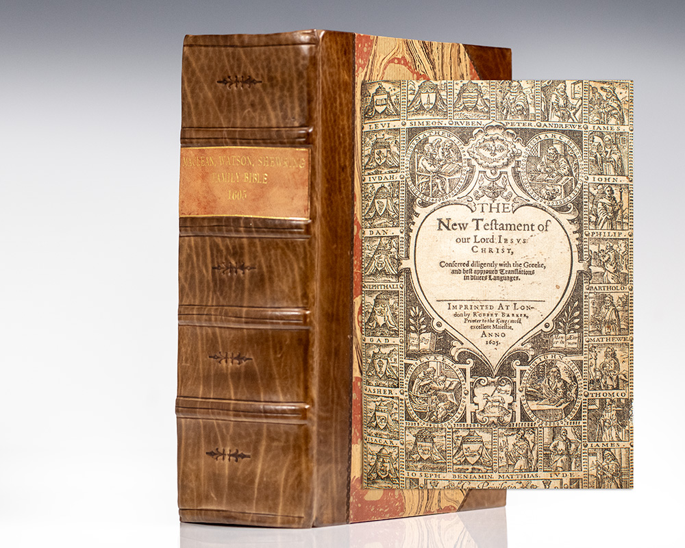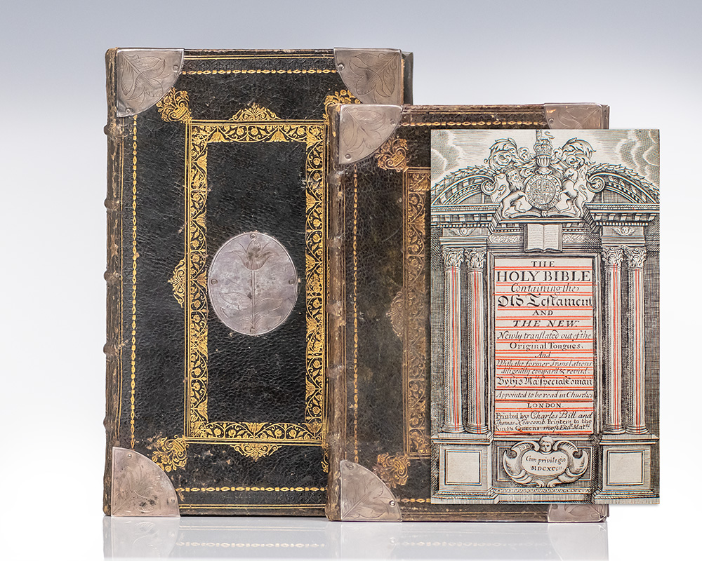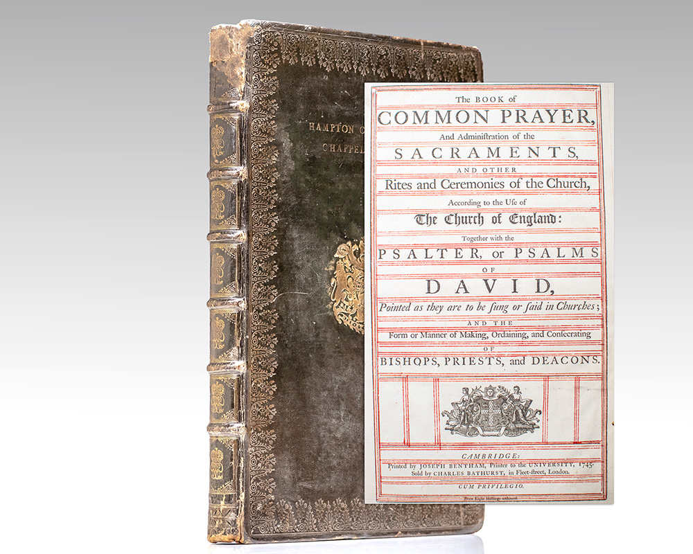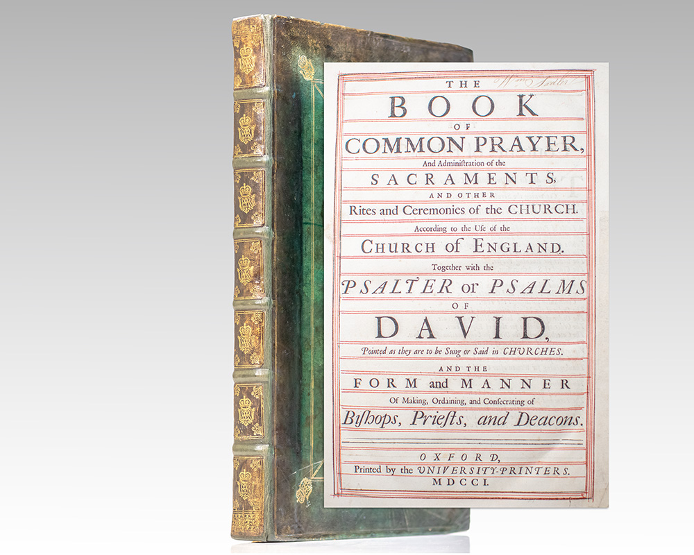 Rare early 18th century Book of Common Prayer in a royal binding bearing the ciphers of Queen Anne. Folio, bound in full contemporary green calf with gilt royal ciphers of Queen Anne to the spine in seven compartments within raised gilt bands, rebacked, gilt paneling and scrolling to the front and rear panels with royalContinue reading "The Book of Common Prayer, and Administration of the Sacraments, and other Rites and Ceremonies of the Church. According to the Use of the Church of England. Together with the Psalter or Psalms of David, Pointed as they are to be sung or said in Churches: And the Form and Manner of Making, Ordaining, and Consecrating of Bishops, Priests, and Deacons."