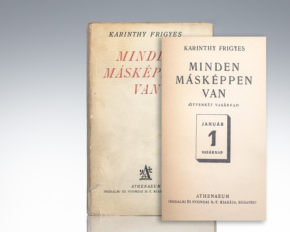 Rare first edition of this collection of stories in the original Hungarian which introduced the sociological phenomena of “six degrees of separation.” Octavo, original wrappers with titles in red and black. In very good condition. Exceptionally rare in the original wrappers.