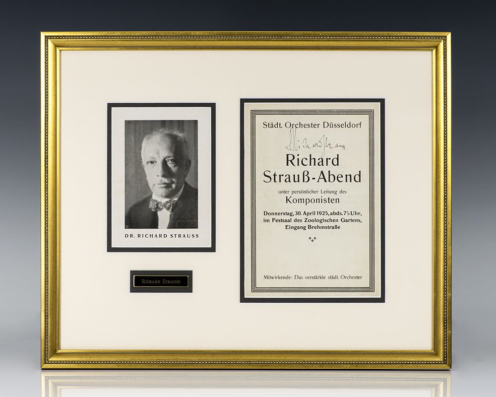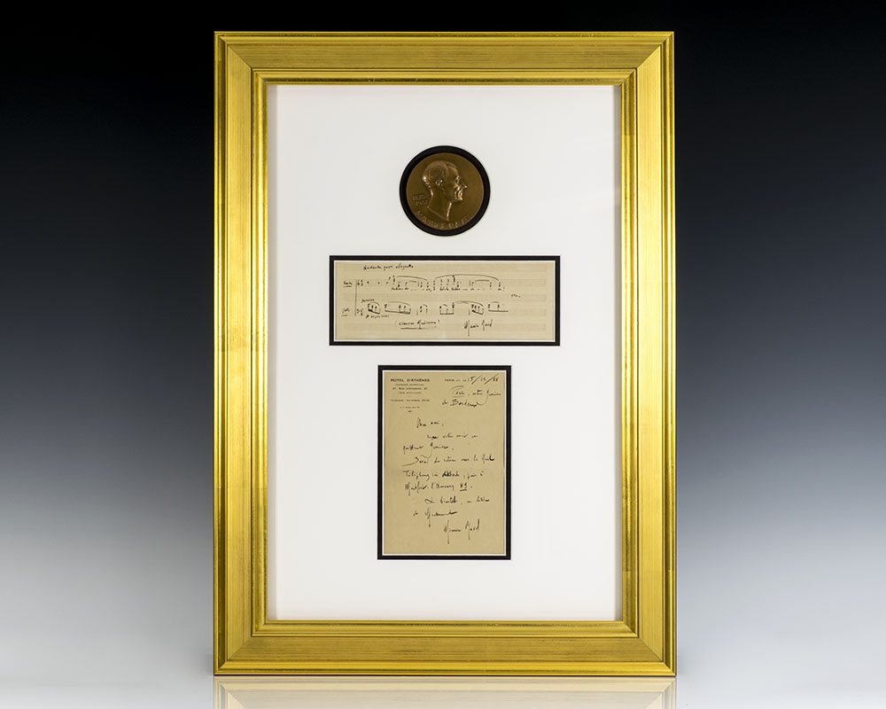 Handwritten musical quotation inscribed by Russian composer and pianist Dmitri Dmitriyevich Shostakovich in Russian above the opening three bars of Shostakovich’s Symphony No. 5 in D minor (Op. 47) on a two-stave system with holograph tempo directive and title, “To Lionel Okvin from Dmitri Shostakovich 17th February 1947.” Double matted and framed with a photographContinue reading "Dmitri Shostakovich Autograph Musical Quotation Signed."