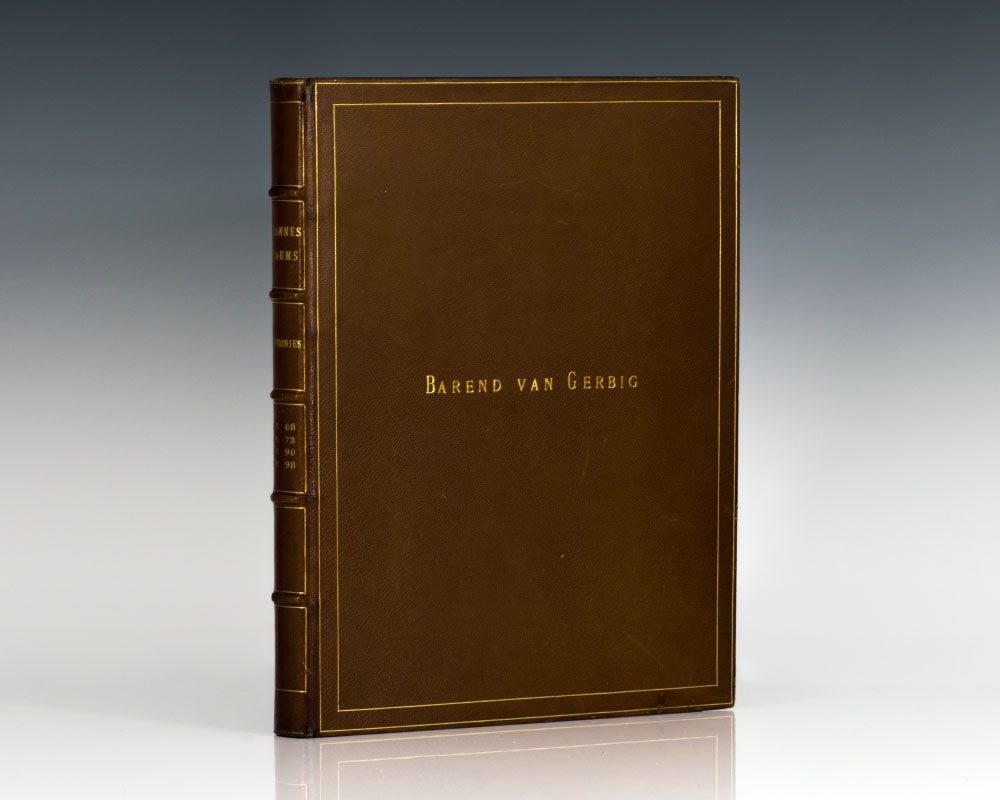 The first four symphonies. Opus 68, 73, 90, 98, the orchestral scores, Quarto, bound in full morocco, gilt titles and tooling to the spine, front and rear panels, inner dentelles, all edges gilt, marbled endpapers. First Symphony (plate 7957), is first printing, conforming to McCorkle; the balance appear to be early printings. In near fineContinue reading "The First Four Symphonies, Opus 68, 73, 90, 98, The Orchestral Scores."