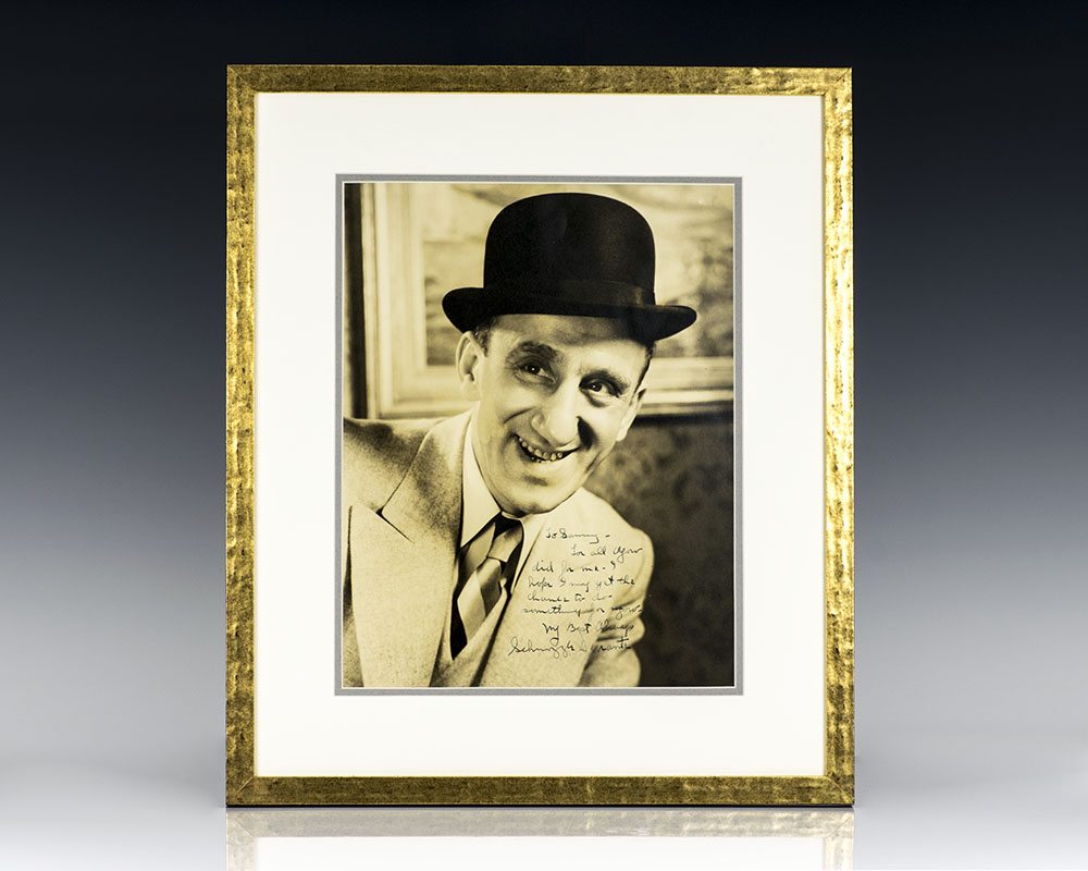 Large photograph of Jimmy Durante, inscribed by him, “To Sammy – For all you did for me – I hope I may get the chance to do something for you. My Best Always, Schnozzle Durante.” The photograph measures 11 inches by 14 inches. Double matted and framed.