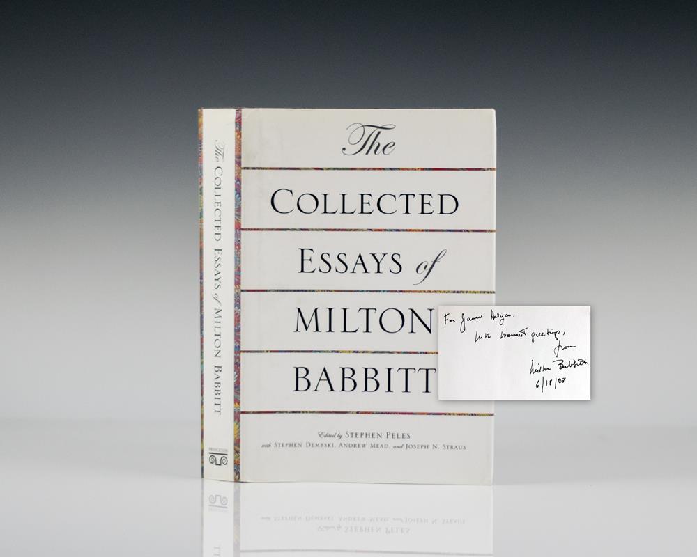 First edition of the compilation of the essays of the great composer Milton Babbitt. Octavo, original boards. Inscribed by the composer, “For ____ _____, With Warmest greetings, from Milton Babbitt 6/18/08.” Fine in a fine dust jacket.
