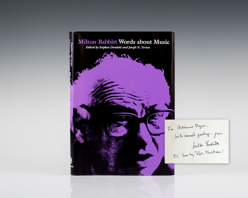 First edition. Octavo, original cloth. Fine in a fine dust jacket. Inscribed by the Babbitt, “For _____ ______, With warmest greetings, from Milton Babbitt P.S. how ty Rot-partitione!” Edited by Stephen Dembski and Joseph N. Straus. A very nice inscription.
