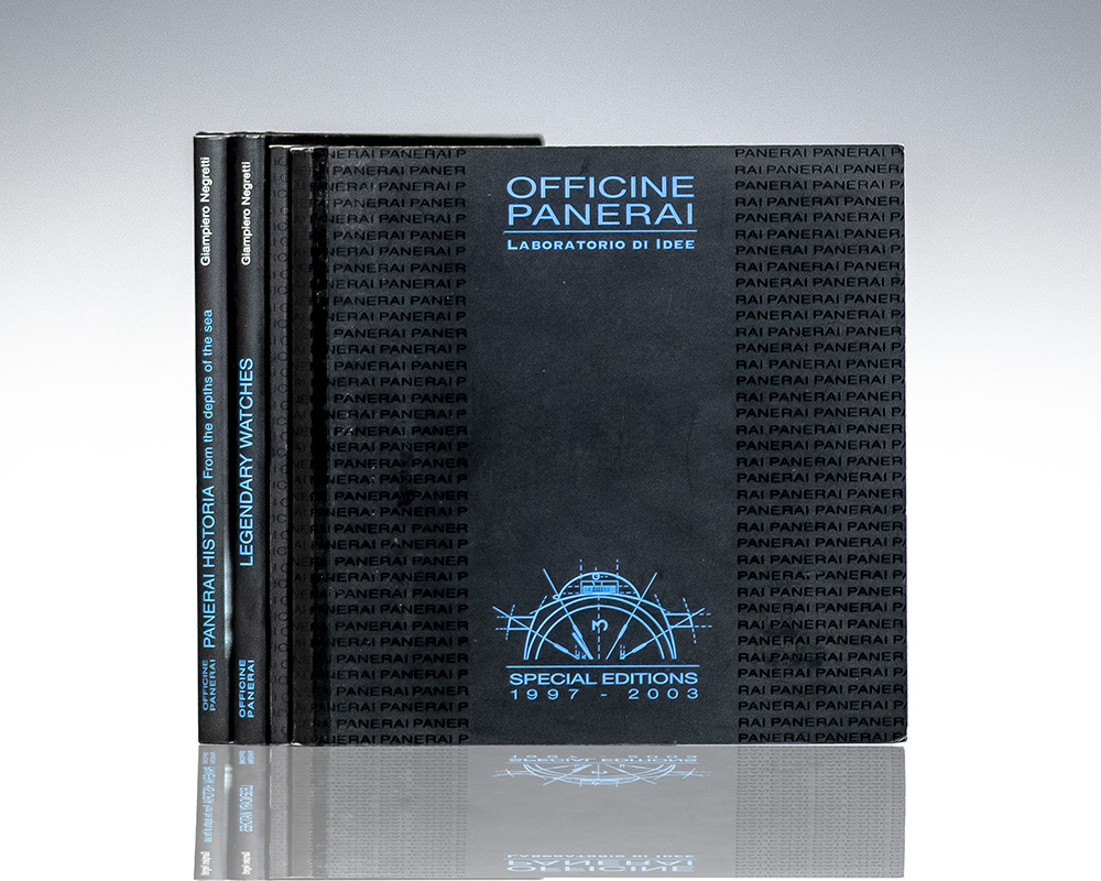 Limited first editions of these extravagant photographic timelines of Panerai watches. Oblong duodecimo, original boards, generously illustrated with luminous photographs of Panerai watches and the people involved in their creation, diagrams of their designs, and pictures of other engineering exploits undertaken by the company, the collection includes a first edition of ‘Legendary Watches’ (Novate: ArtiContinue reading "Four Volume Collection of Legendary Panerai Watches."
