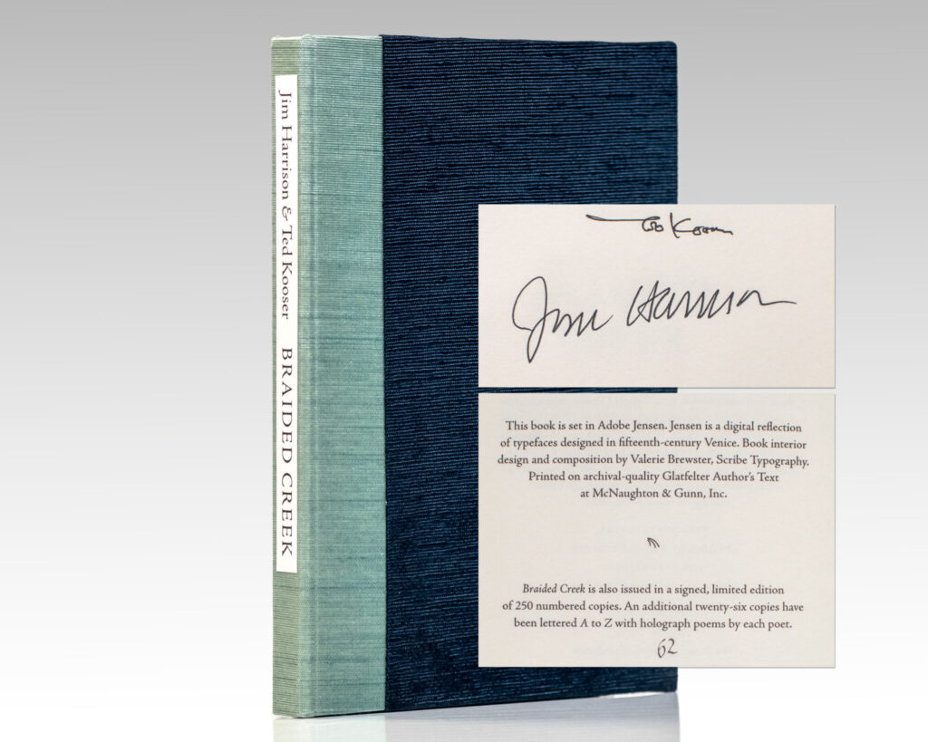 First limited edition of this collection of poems that were essentially a poetical conversation between Harrison and Kooser. Duodecimo, original publisher’s half-cloth with paper titles to the spine. One of 250 numbered copies, this is number 62. Boldly signed by Jim Harrison and Ted Kooser on the half-title page. In fine condition.
