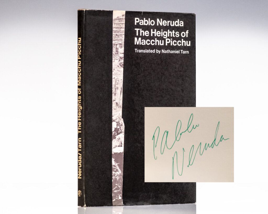 First edition in English of Neruda’s masterpiece. Octavo, original cloth. Boldly signed by Pablo Neruda on the half-title page. Translated by Nathaniel Tarn. Preface by Robert Pring-Mill. Fine in a near fine dust jacket. A very sharp example, rare and desirable signed.