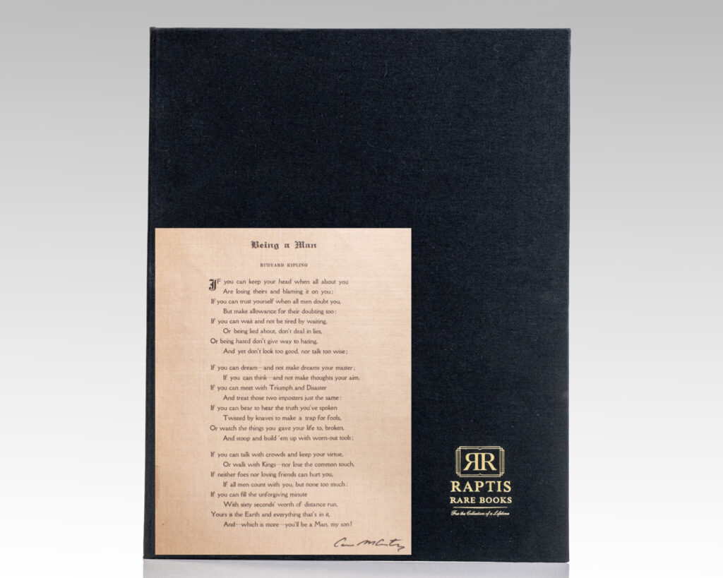 Rare print of Rudyard Kipling’s poem Being a Man, more commonly referred to as “If-“. One page, typed. Boldly signed by author Cormac McCarthy at the bottom right corner. Cormac McCarthy (1933–2023) was an American novelist whose stark prose and often violent themes earned him recognition as one of the most influential literary voices ofContinue reading "Being a Man [If-]."