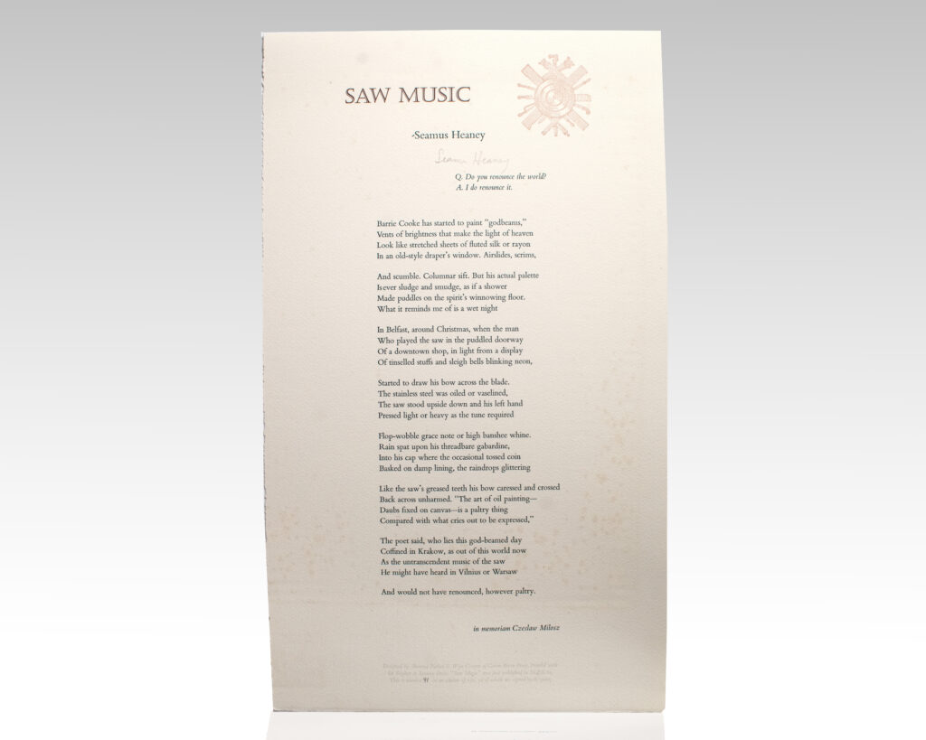 Original broadside by the Nobel Prize-winning poet, one of 200 numbered examples, signed by Seamus Heaney, designed by Shawna Parker and Wyn Cooper of Green River Press and printed with Ed Rayher at Swamp Press. The poem, which first appeared in AGNI 61, was written in memory of Czeslaw Milosz. OCLC locates only four copiesContinue reading "Saw Music Broadside."