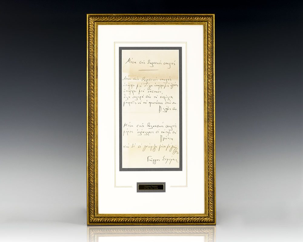 One page signed handwritten poem completely in the hand of George Seferis. Translated from the Greek: “In the sea caves, there’s a thirst there’s a love, there’s an ecstasy, all hard like shells, you can hold them in your palm. In the sea caves, for whole days I gazed into your eyes, and I didn’tContinue reading "In The Sea Caves. George Seferis Poem."