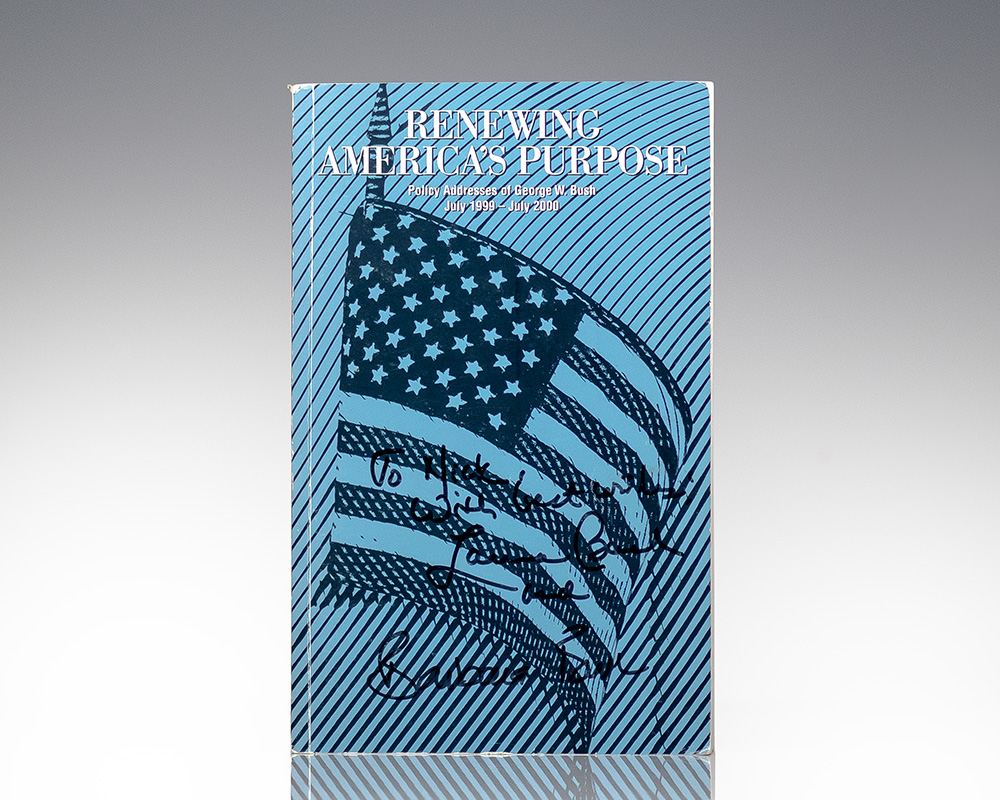 First edition of this collection of policy addresses. Octavo, original wrappers, illustrated with graphs and photographs. Boldly inscribed by First Ladies Laura Bush and Barbara Bush on the cover, “To Nick with best wishes: Laura Bush and Barbara Bush.” In near fine condition.