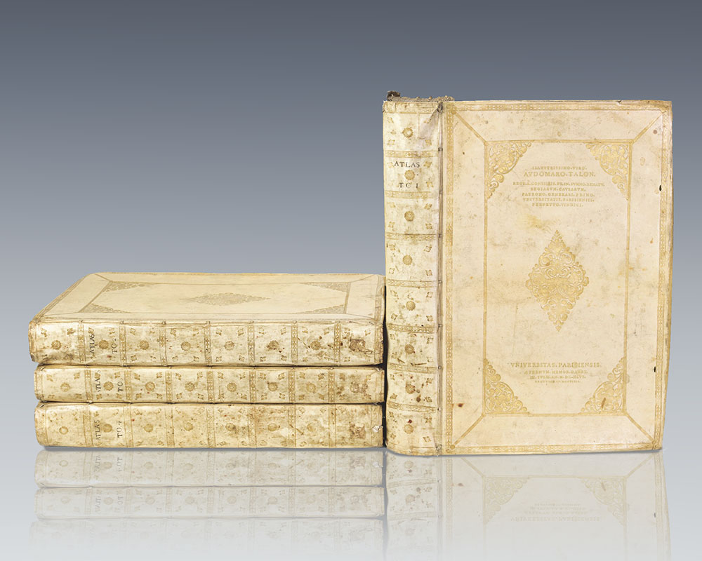 A fine French-text copy in a presentation binding. Folio, 4 volumes, contemporary Dutch vellum likely from the Blaeu workshop with gilt tooling to the spine in eight compartments within gilt bands, central gilt arabesques and fleuron corner pieces within double gilt ruling to the front and rear panels, all edges gilt. Gilt presentation inscription toContinue reading "Theatrum Orbis Terrarum. [Le Theatre du Monde]."