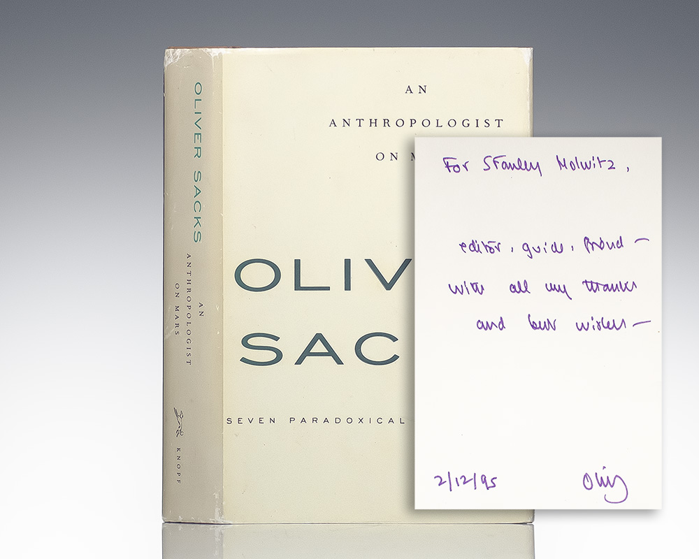 First edition of this astounding collection of unique medical histories. Octavo, original half cloth, illustrated with color plates. Association copy, inscribed by the author on the front free endpaper to his editor in the year of publication, “For Stanley Holwitz, editor, guide, friend – with all my thanks and best wishes – 2/12/95 Oliver.” NearContinue reading "An Anthropologist on Mars: Seven Paradoxical Tales."