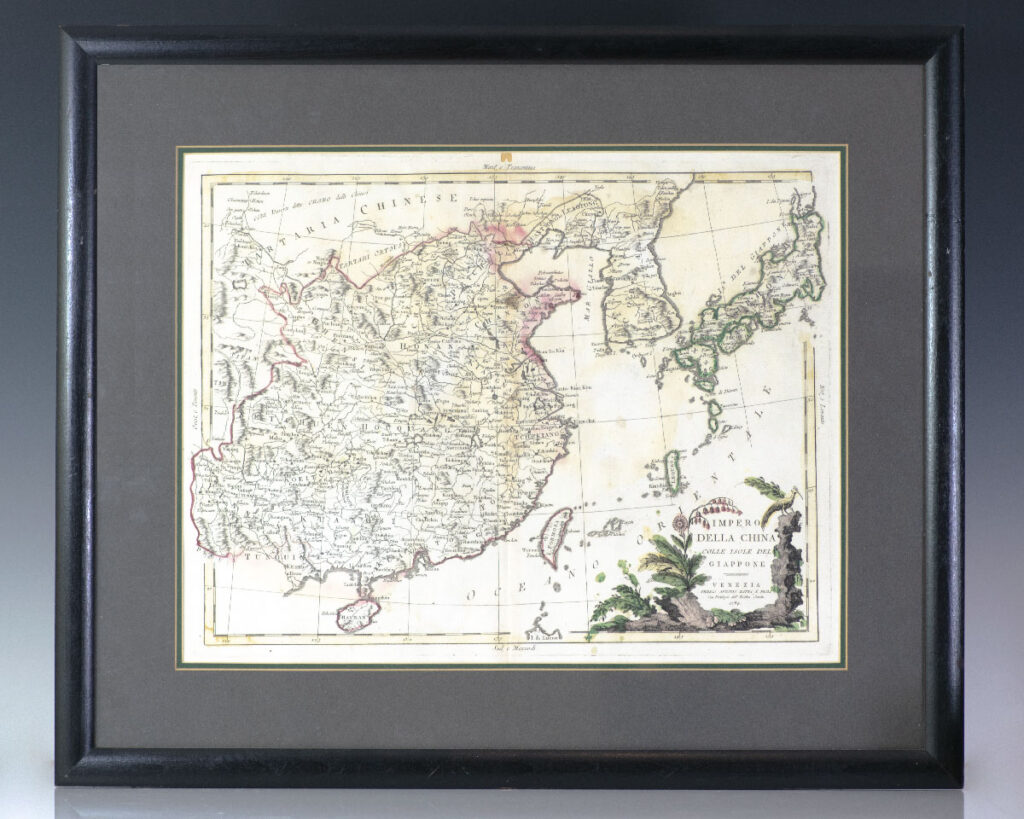 Large eighteenth century hand-colored map of China and Japan by Venetian cartographer Antonio Zatta. One page, hand-colored with a fine botanical cartouche. In near fine condition. The entire piece measures 19.5 inches by 23.5 inches.