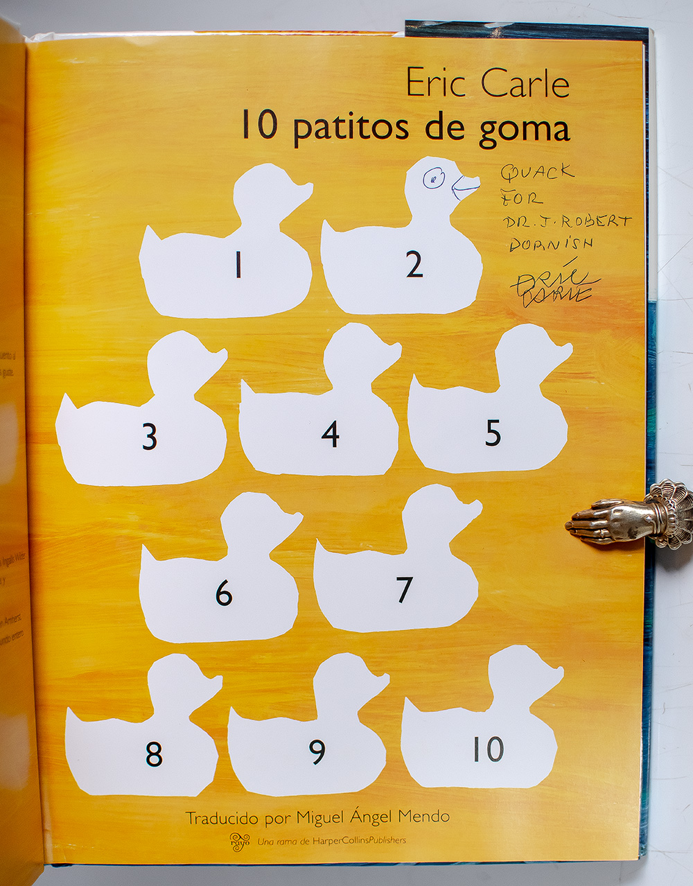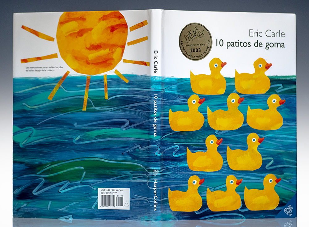 First Spanish language edition of 10 Patitos De Goma. Quarto, original publisher’s pictorial boards, patterned endpapers. Presentation copy inscribed by the author "Quack for Dr. J. Robert Dopinish Eric Carle." Fine in a fine dust jacket. Jacket illustration done by Eric Carle.