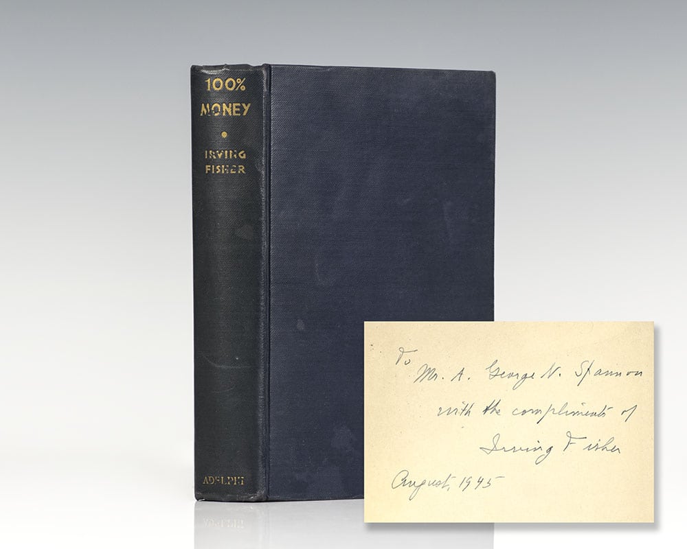 First edition of the revised edition of Fisher's 100% Money. Octavo, original cloth. Inscribed by the author on the front free endpaper, "To Mr. A. George N. Stannon with the compliments of Irving Fisher August 1945." In near fine condition.