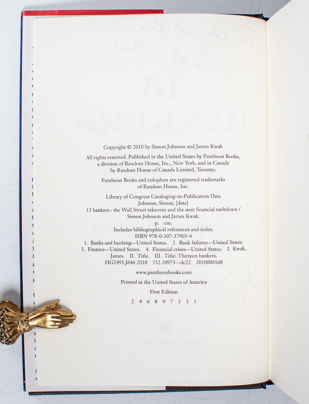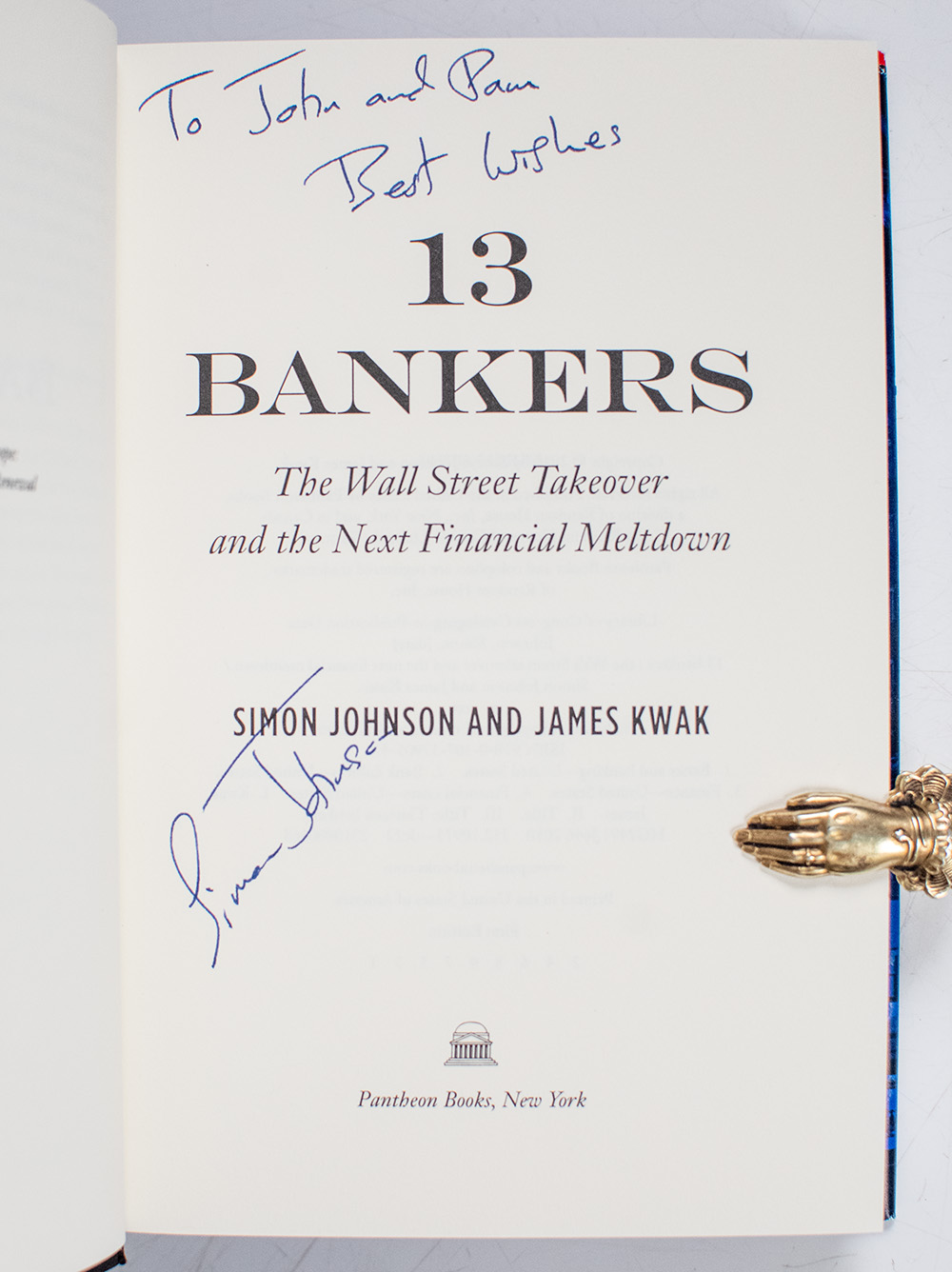 First Edition of Simon Johnson and James Kwak's 13 Bankers; inscribed by Nobel Prize-winning economist Simon Johnson